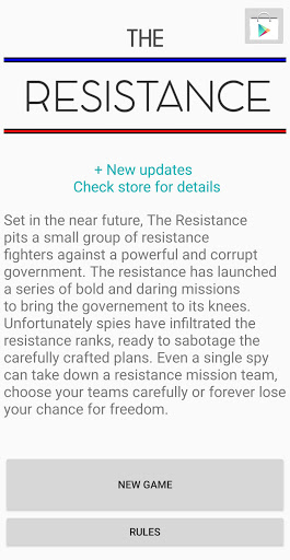 The Resistance is a local play game, which requires a minimum of 5 players. In the game players attempt to find out each others identities. The setting of the game is an imagined battle between a resistance group trying to overthrow the malignant government and the government spies infiltrating the resistance group. It is similar in structure to party games such as Mafia and Werewolf, where a small, secret group of informed players attempt to disrupt a larger uninformed group, while the larger group attempts to identify the spies and eliminate them.