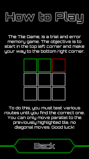 The Tile Game, is a trial and error memory game. The objective is to start in the top left corner and make your way to the bottom right corner.