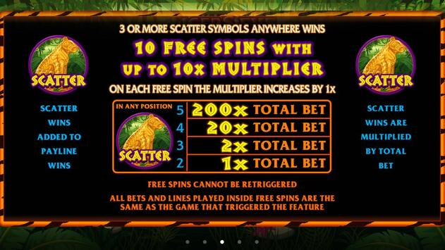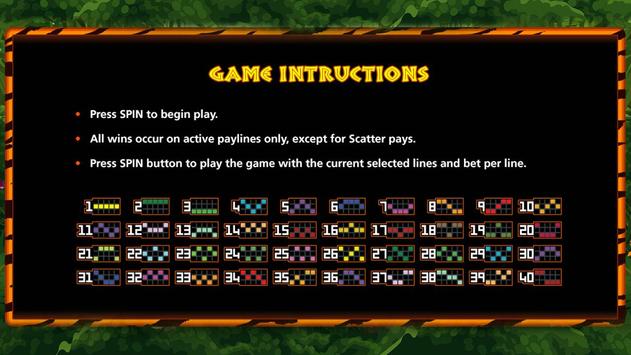 Stalk BIG wins on the 5-reeled slots with 40 lines to place your bets on. There are loads of winning combinations! Can you match 5 symbols in a row? Each round starts with 1200 free coins, so you’re always well-equipped to thrive in the jungle! You can also reset your coin balance by returning to the main menu.