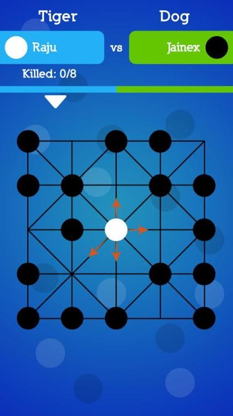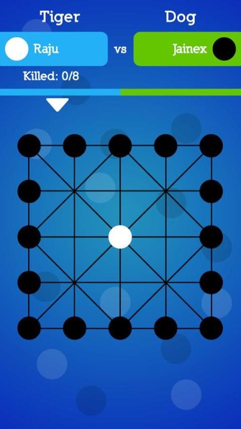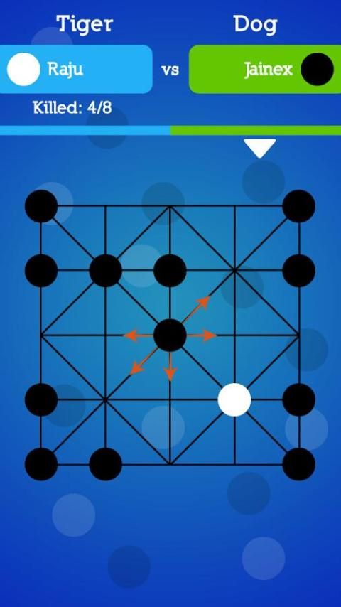 • When the tiger enters a position such that the following condition hold two dogs are adjacent to this position such that they three are in the same line, and also these two dogs have no adjacent dogs in the same line, then these two dogs are killed by the tiger. If 8 dogs are killed, then the tiger player wins and the dog player loses.