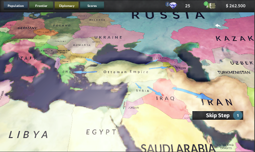 You can start choosing a country which you want. After starting, each country has a economic power proportional to population. For example; if you conquer big countries, you earn more money than normal.