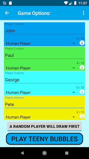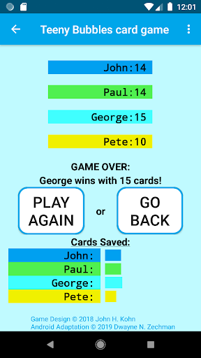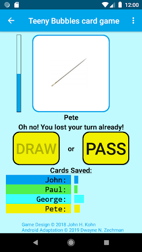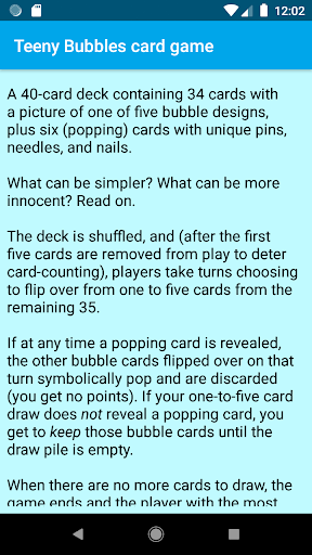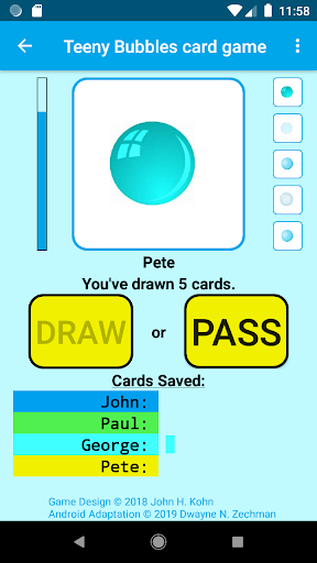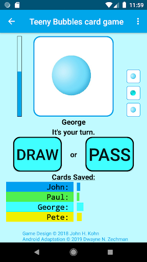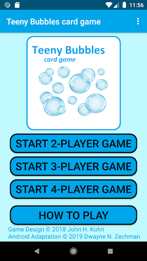 Teeny Bubbles card game is an Android adaptation of a real-world card game invented by John H. Kohn for 2-4 players, which includes solo play against a variety of computer opponents, each with their own unique strategies. Can you beat the "Impossible" opponent who has X-Ray Vision?
