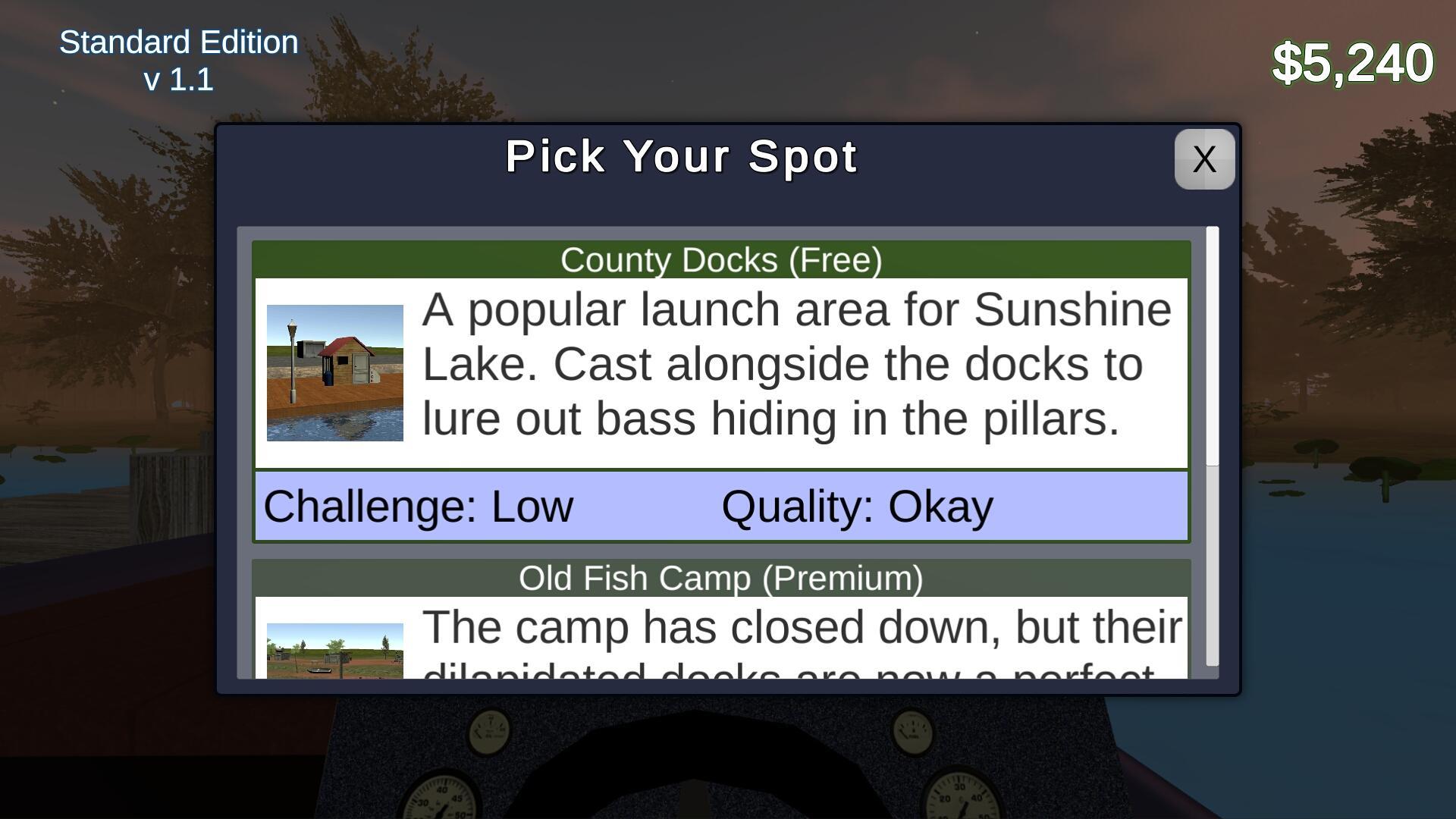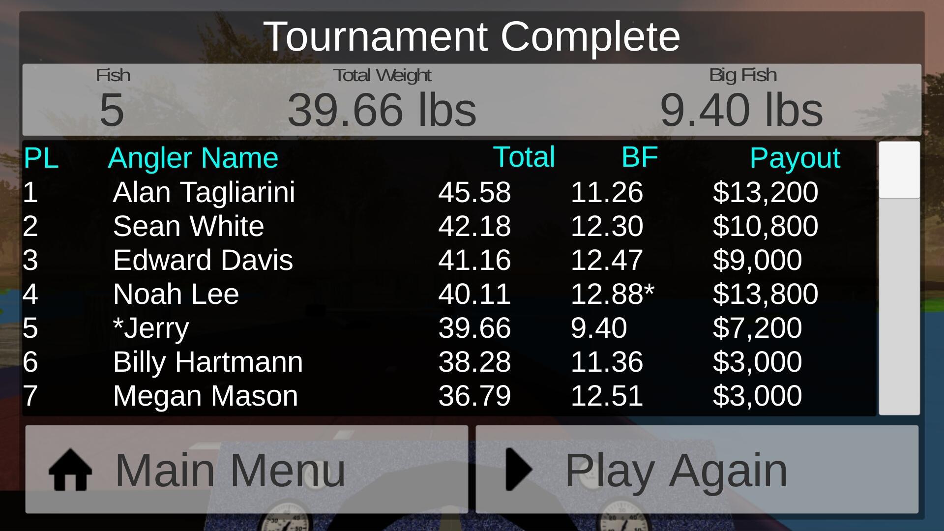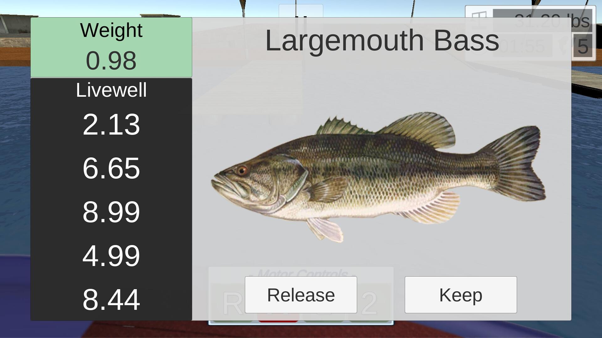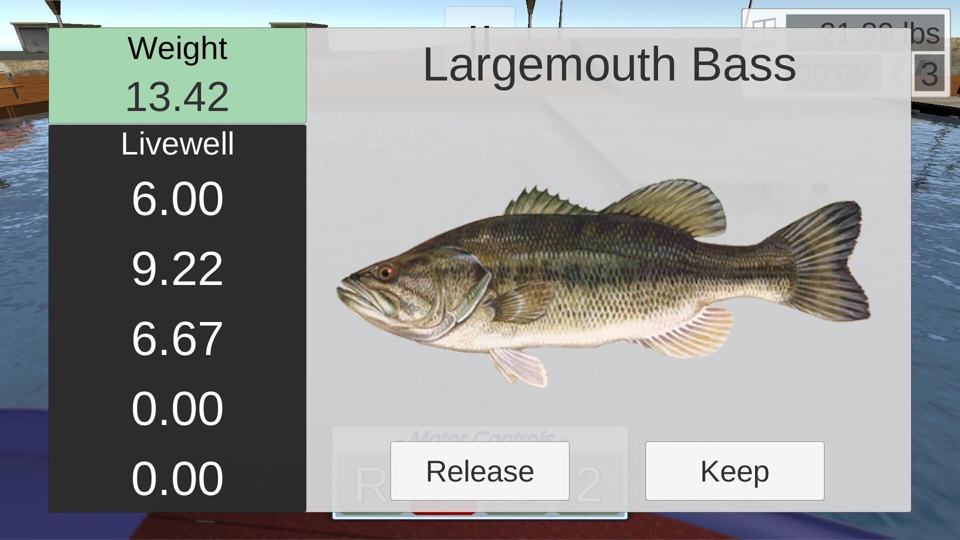 Only 5 bass can be kept in the livewell. You’ll need to decide whether to keep, or release, each fish you catch. If the livewell is full and you keep a bass, the smallest one will be released automatically. Making a mistake can lower your overall weight! Time is money, so you’ll have to make decisions fast to get the most out of your time on the water.