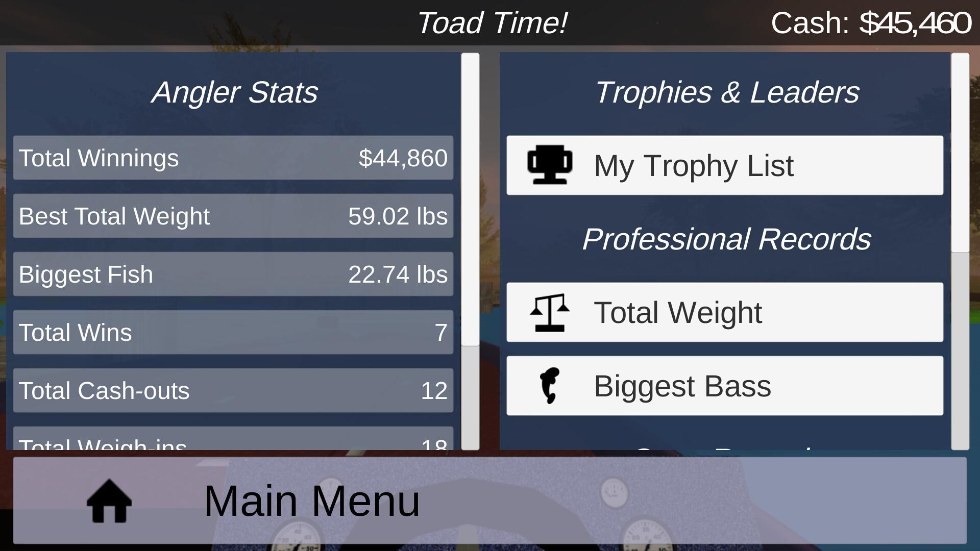 Dominate the exciting world of bass fishing tournaments with topwater toads! Toad Time is a unique first person bass fishing game with a focus on beating the banks (a.k.a. fishing along the shoreline). Cast around cover while avoiding snags to find the biggest bass and win.