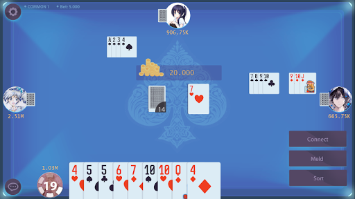 EXAMPLE: He/she Melds straight cards (7♦, 8♦, 9♦), you can now connect your cards with a diamond suit. You can connect your cards with a higher or lower value of card with the same suit (diamond, heart, spade and clubs) (♣ - ♦ - ♠ -♥)