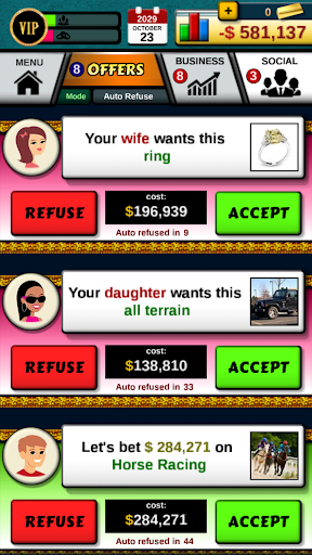 The game says you get money for not overspending I earn 500 she asks for a space flight for 3000000 and I refuse and get a divorce perfect