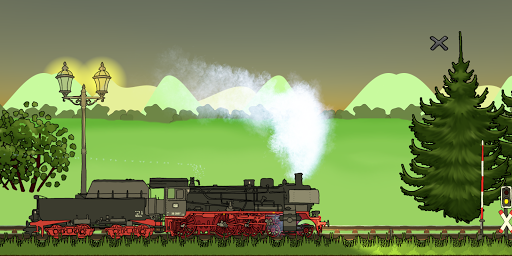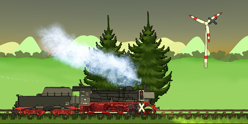 A steam train is running on endless rails. It stops before crossings and coontinues only if the boo bar is lowered. The train and environment are interactable.
