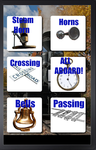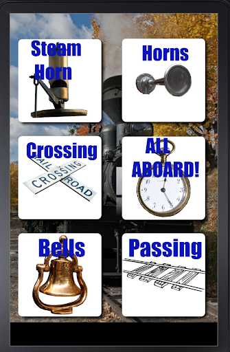 All train horns and sounds located on one page with easy to use buttons with clear labels and horn, bell, and train icons.