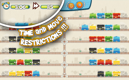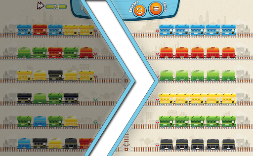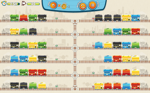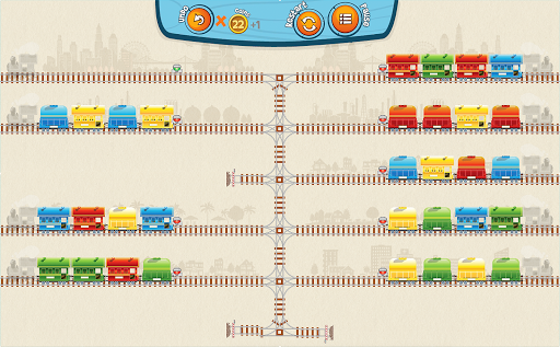 On every of 225+ carefully selected levels, you will get a shuffled combination of railroad tracks layout and railroad carriages, that you will need to arrange the carriages, matching their shape and color. Simply drag the railroad carriage from one track to another, trying to form a railroad train consisting of identical carriages of the same color. A railroad carriage can be moved either into an empty track, or behind the one of the same shape and color. If a player gets to an impasse, the strong game AI, in just few milliseconds will parse all possible solutions and will hint about the problem and suggests to roll back to the last solvable state.
