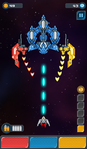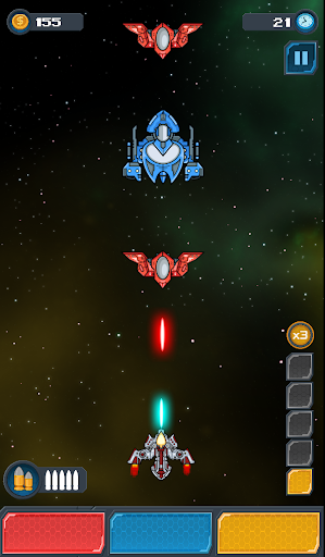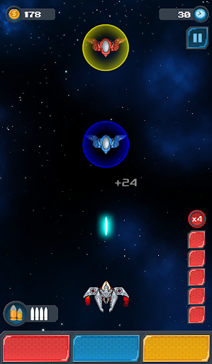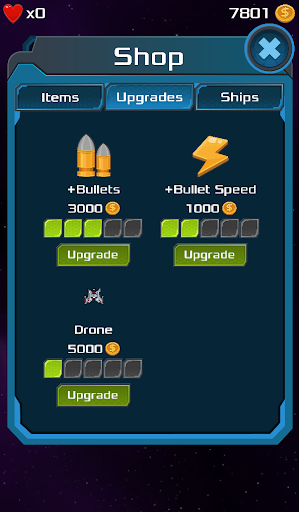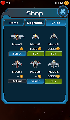 Level up and beat more difficoult enemies. Don't forget to visit the shop to get the top upgrades for your ship and buy all kind of items to destroy all the enemies.