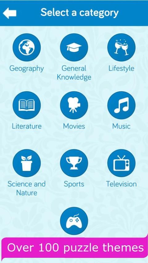 Choose from puzzle categories including Geography, General Knowledge, Lifestyle, Literature, Movies, Music, Science and Nature, Sports, Television and Toys and Games.