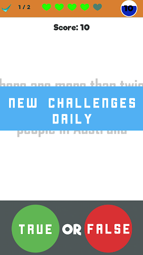 Get ready for the best of Quiz Trivia. We bring to you a classic game of True or False, a game for all ages! Adults and kids alike can enjoy playing True or False during their free time which not only is fun to play but also increases the knowledge of friends and family. People who love to quiz will truly love this game. This game is to increase the General Knowledge!
