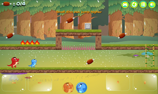 Very cute dinosaur brothers adventure game has come out. big dinosaurs can step on fire, and small dinosaurs jump higher. They are good friends and often venture out together. This time they came to the forest looking for roast chicken. Come and venture with them .