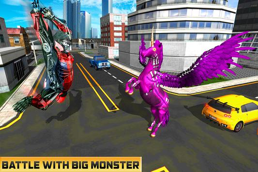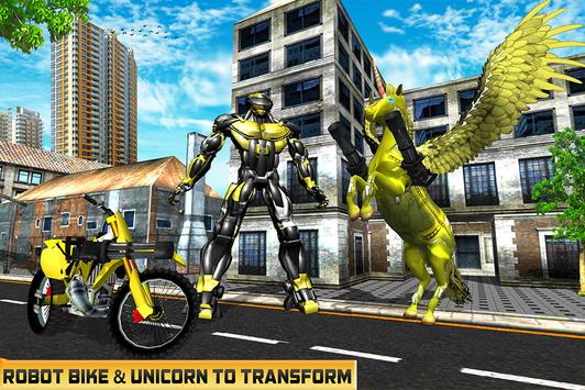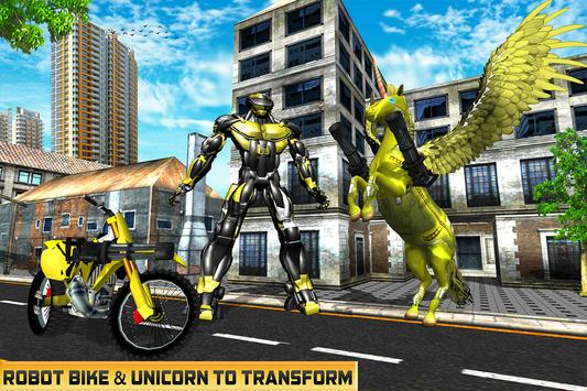 Us Robotic Unicorn Transform Bike Game is New robot battle game with interesting gameplay where you play as Robotic unicorn as well as robot hero to save innocent civilians from evil forces. . Choose your favorite flying robot that can transform into robotic unicorn as well as super-fast bike to fight with that evil battle machines in this action gameplay. You can fly in the air to watch the dangerous activities of the vicious gangsters. Save the innocent peoples with the help of laser attack, backflip kick and with amazing robots fighting combos.