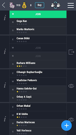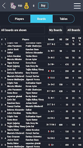 - Join to individual or pair tournament (duplicate bridge IMP or MP scoring system)