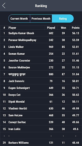- Scoreboard daily, weekly or monthly (only for tournament rating)