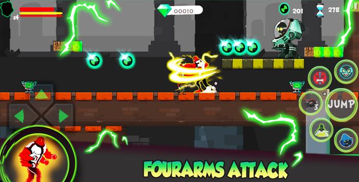 To complete Four arms the platformer diversion Ben should hop and keep running over numerous force hindrances, tennyson battle and up to speed shoot Heatblast jump against transform chibi ninjas, vilgax , savage sharks, dragons, skeletons, pirates, traps, felines and numerous different beasts and mythical bats.