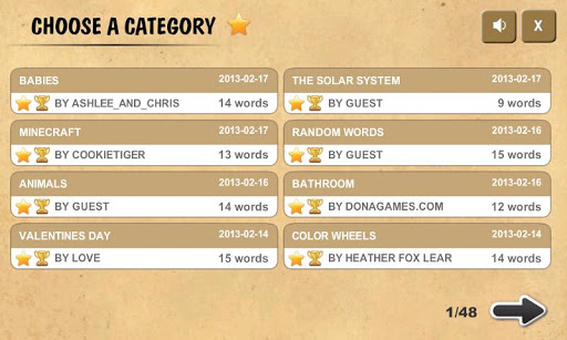Requirements: flash PLAYER is required to play this game!Why to have million of word search games when you can have them all in one game?Ultimate word search is a collection of over 300 free word search games (and more added every few days) and what more? All the word search categories are high-scored based, so you can compare your score with other people all around the world! The categories include for example games about One Direction, Angry birds Take That + more than 300 other categories you will surely like!How to play:find all the words from the list on the right as fast as possible! Submit your score to see who is the best! To select the word press on the letter and drag to select it!* global highscores!* over 300 categories and more still added!* totally free game!* you can save categories to your favorite so you can play them later faster and also offline!* we will add more features, for example a searching or word search maker, so you will be able to make your own game, if the game will get enough of downloads!Enjoy our word search game and please dont forget to rate it if you like our game! It will help us a lot to improve the game!Thanks and check out also our other FREE WORD SEARCH games in our profile!