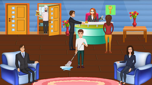 Virtual Hotel Tycoon Manager game will start from the hotel entrance lobby. This guesthouse simulator game will give you the better experience for your real life manager job in easy steps. Give room & suites key to the customers and guide them towards their respective rooms. Keep an eye on their rooms as they will ask for room service, laundry or cleaning services. Tap on the service icon to send them to perform their home cleaning activities. Once they check out, receive coins from them to clear levels. Enjoy and become a professional hotel manager in future life like and give us the gaming experience about the Virtual Hotel Tycoon Manager.