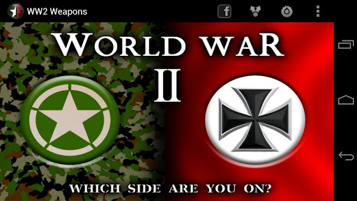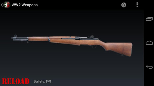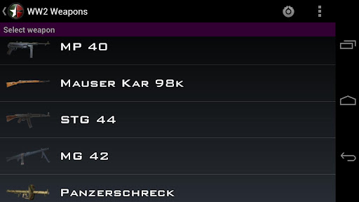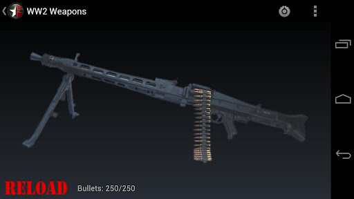 Weapons of World War 2 Now available for Android amp; iPhone With this app you will have the most famous weapons of the World War II in your phone, with great sounds and high quality reallife images List of guns included ALLIES Colt 1911 Thompson M1 Carbine M1 Garand 1918 BAR Automatic Rifle M1919 Browning Machine Gun Bazooka Mk2 Grenade AXIS Welther P38 Mauser C96 MP 40 Mauser Kar 98k STG 44 MG 42 Panzerschreck StielhandgranateIf you like this app try our other free apps: Animal Sounds Battlefield Guns CoD Guns CS Guns Desert Eagle Modern Warfare Guns MW3 GunsIf you want to add some feature or find a bug send us an email