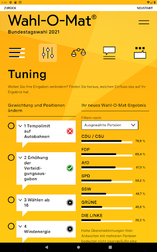 - Zgodnie z Tuningem, możesz dostosować swoje pozycje i ważenie i oglądać bezpośrednio, aby wpłynąć na Twój zmiany w wyniku wyniku na wymienione tezy. Strony są rozmieszczone i wyświetlane zgodnie z ich odpowiedziami (głosowanie, neutralne, głos) i wyświetlane.