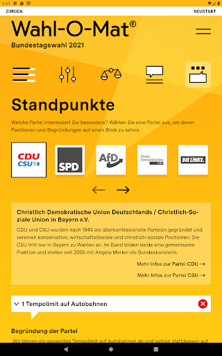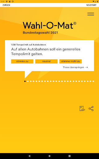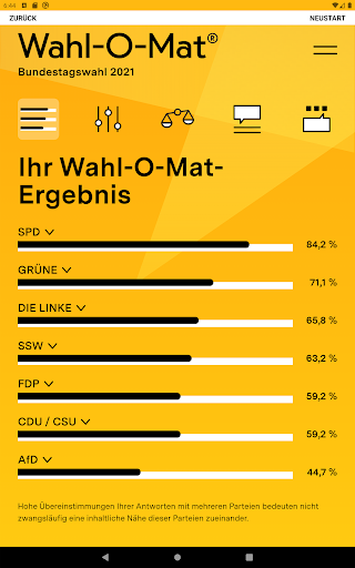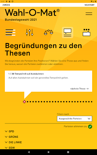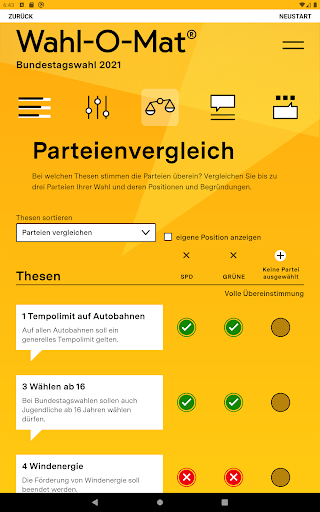 Wybór O-MAT to pytanie - Narzędzie-reagowanie, które pokazuje, które są najbliżej strony zatwierdzonej przez wybór własnej pozycji politycznej. 38 Tezy polityczne można odpowiedzieć za pomocą "głosu", "nie jest zbyt" głosem "," neutralny "lub" pomijanie pracy ". Wszystkie strony zatwierdzone do wyborów są zaproszone. uczestniczyć w wyborach o-mat. W ten sposób możesz równać swoje odpowiedzi na te strony. Wybór-o-mat nie jest rekomendacją wyborczą, ale oferta informacyjna w wyborach i polityce imprezy. Klikając nazwy partii, znajdziesz krótkie opisy wszystkich stron. W obszarze "Więcej informacji na imprezę" weźmiesz naukowy krótki profil odpowiedniej strony.