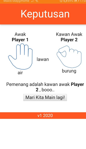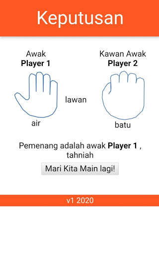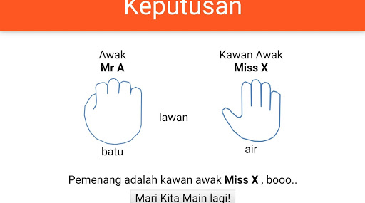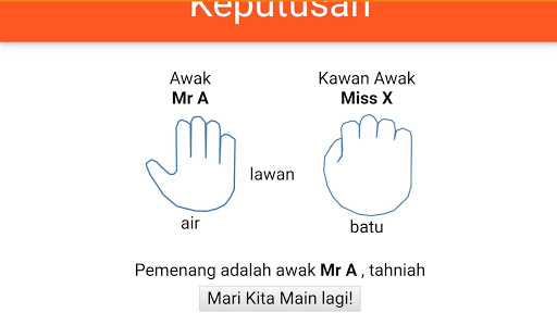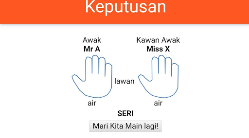 This games originated from Malaysian kids ways to determine who wins. Each player shows palm hand as a symbol of bird, water or rock. Bird will win against water but loss against rock. Water wins against water. A very popular and simple game when kids need to make decision among themselves.