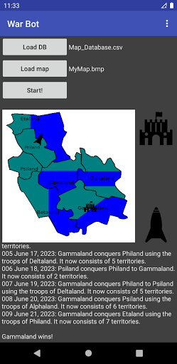 For every iteration, an image file representing the current situation is saved together with a history file tracking all the battles so far. A written summary is also generated at configurable intervals.