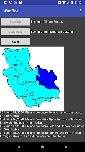 The territories are loaded via a CSV database and a colored map (examples are available in the app), the database must be UTF-8 encoded.