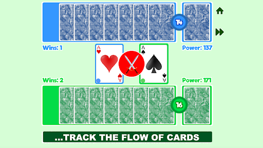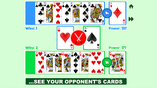 In the event that the two cards played have equal value, a "war" occurs. Depending on the settings, 1 to 15 cards are placed on the table, and once again, the player with the higher card wins the "battle" and takes all the cards involved.