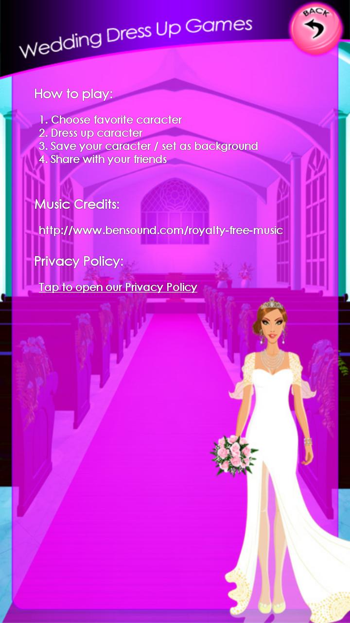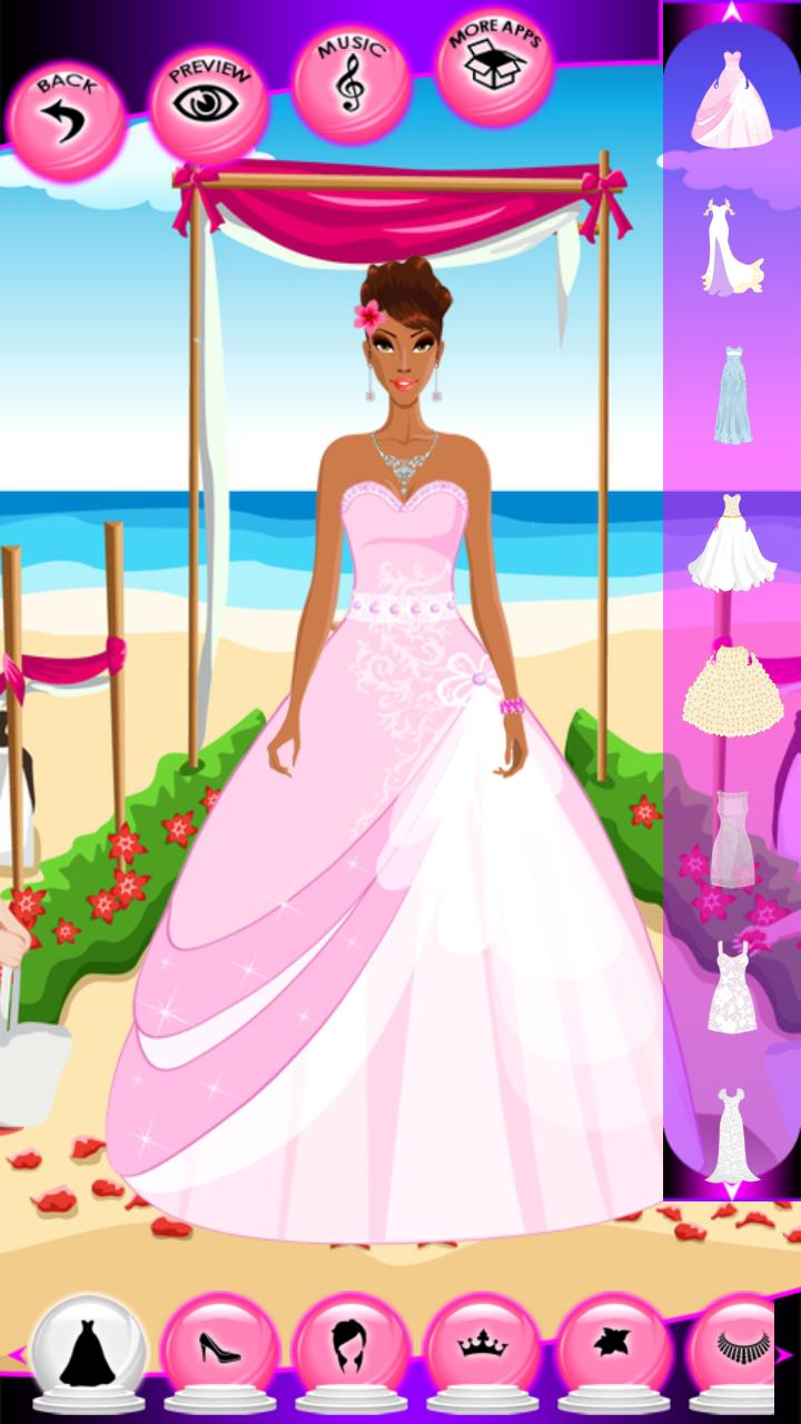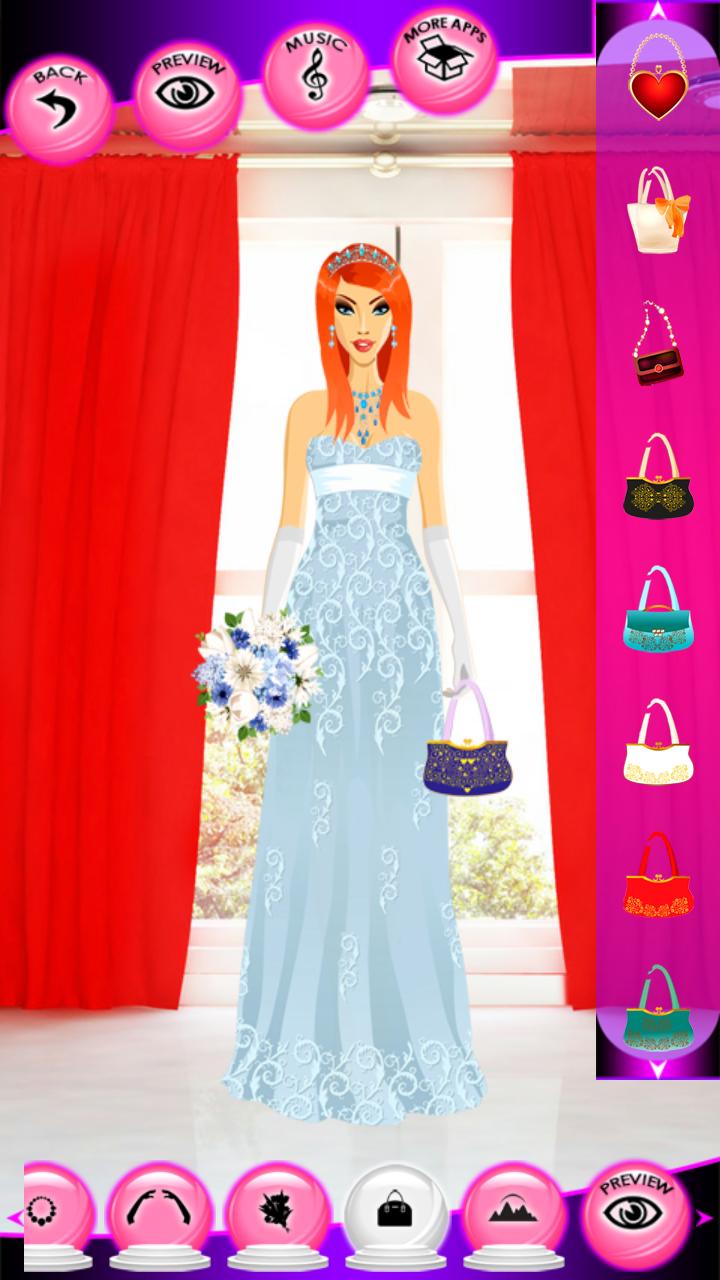 Every girl dream about perfect wedding ceremony, gorgeous dress and unique ring with jewels. Do you dream about your unforgettable wedding day with man you love. Our new Wedding Dress Up Games app can help you to organize your wedding on best way, and take some good wedding ideas. But first, play the game, and help to our bride and groom to dress up, make up and makeover well for their unique romantic day. Out fashion star is very excited and nervous, because she can not find a proper wedding dress for ceremony. Our bride has just finished spa salon making up, and now she wants to dress up for wedding.