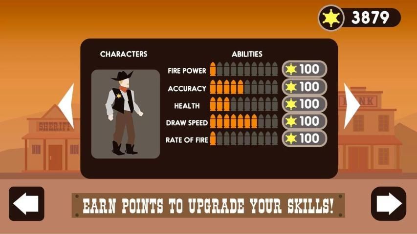 Earn points for each successfully defeated opponent and buy new interesting cowboy characters with their own special stats! Power-up your skills to become faster, stronger and defter! Kill all your rivals in a flash and become a legend of Wild West!
