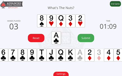 AdvancedPokerTraining.com, the world’s #1 poker training site, has developed the new “What’s the Nuts?” training game to help poker players improve their accuracy and speed in assessing the nuts.