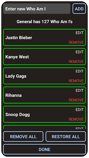 Don’t like the built in name cards? No problem - they are fully customizable! You can view, add to and remove all the built in name cards and create your own unique game making it as child friendly, teenager friendly or adult friendly as you want! We’ve added famous celebrity names from Hollywood, history and the US Billboard charts and more but you could add famous celebrity names from any Country, culture or community and make your own unique game - you could even add people you know!