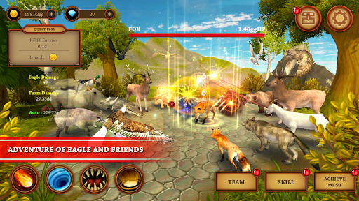 This free app game is a mix between simulator , fighting , hunting and incremental clicker game style by using the main character as bald eagle or another name called white head eagle which man , woman , children and adult can play. Nothing is complicated for playing this game, just tap or click on the screen to let the eagle attack the enemies in the forest, desert, mountain or the treasure chest with hidden gold or diamond or the giant boss for quest accomplished . Team characters need to be developed in order to get stronger for fighting and surviving. Player can find fellows or friends such as duck , fox , goat , seagull or possibly fierce angry wild animals like crocodile , lions etc to fight against the strong enemies.