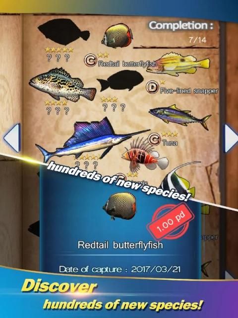 A wide variety of fish awaits you at each fishing spot, where you can catch rare fish like swordfish, amberjack, sailfish, tuna, etc. Learn more about all kinds of fish species from your fish handbook; keep them in your aquarium and sell them for the best price while they grow bigger.