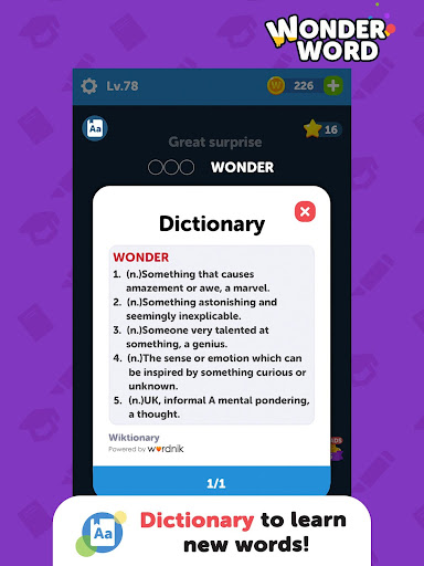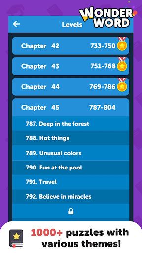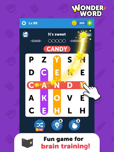 In Wonder Word, there are 1000 fun, challenging puzzles. In each puzzle, you can search the board, link the letters and spell the words. By playing, you will boost your brain power and keep your mind sharp. It will make you a word master and take you on a fun word search adventure!