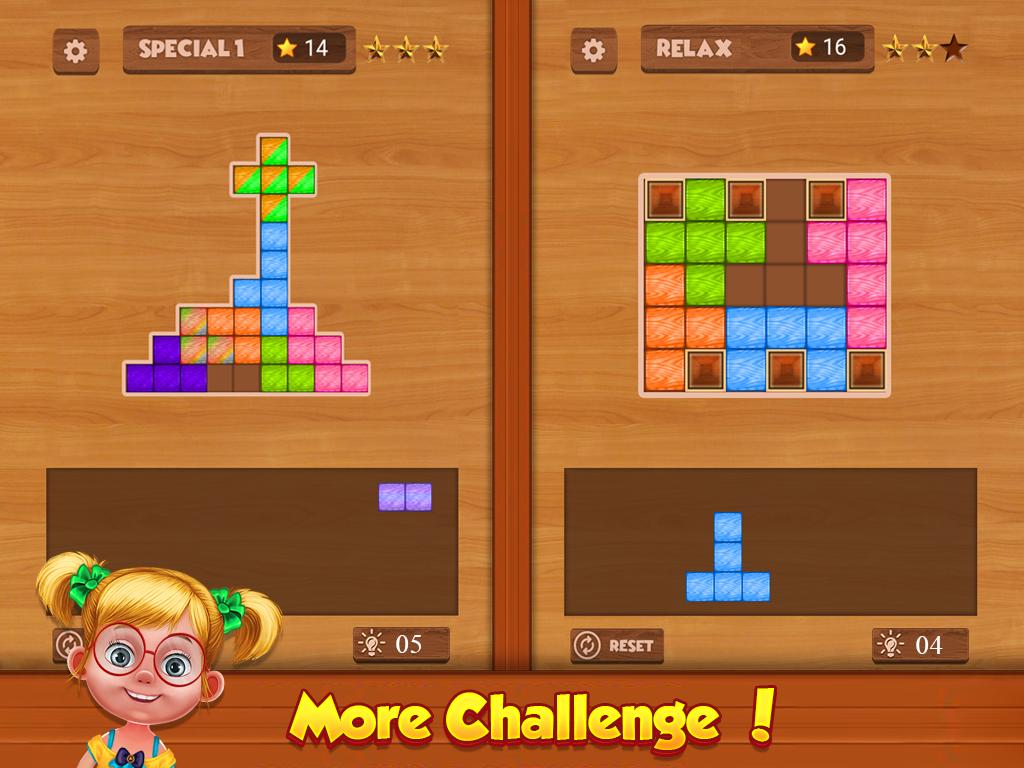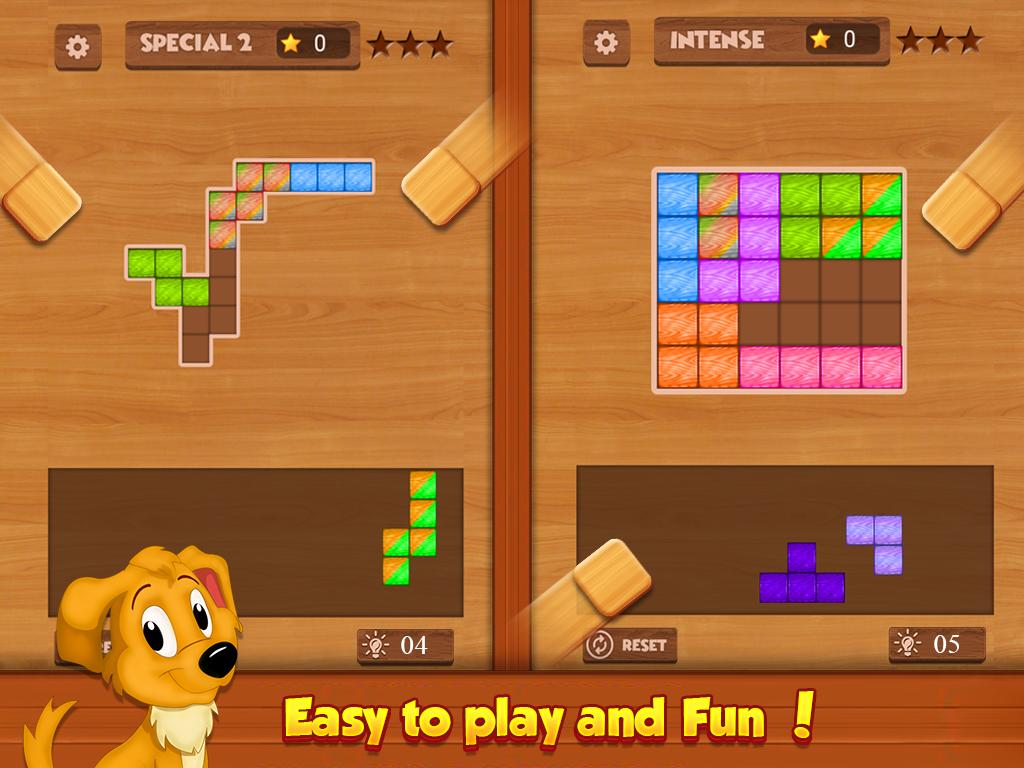 Simply Drag the blocks, and fill up all grids to complete the shape.Easy to play and get addicted while playing this wood puzzle game.