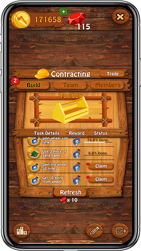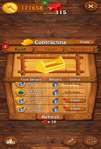 Don't stop there. In Wood Shop Builder you can join a team of contractors or start your own team and be the boss. The benefit of being part of a team allows you and your friends to give or trade hidden items with each other. These items can be exchanged for packages containing spins, coins, and gems! You can also communicate with your team in the team chat. There is also a leader board to display what teams are doing the best!