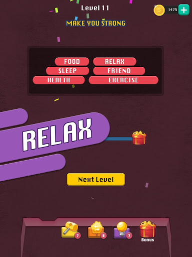 Swipe toward left or right, up or down to uncover the hidden words. Boost personal achievement through crashing blocks to eliminate the whole. Use different tools to assist to find tricky words.