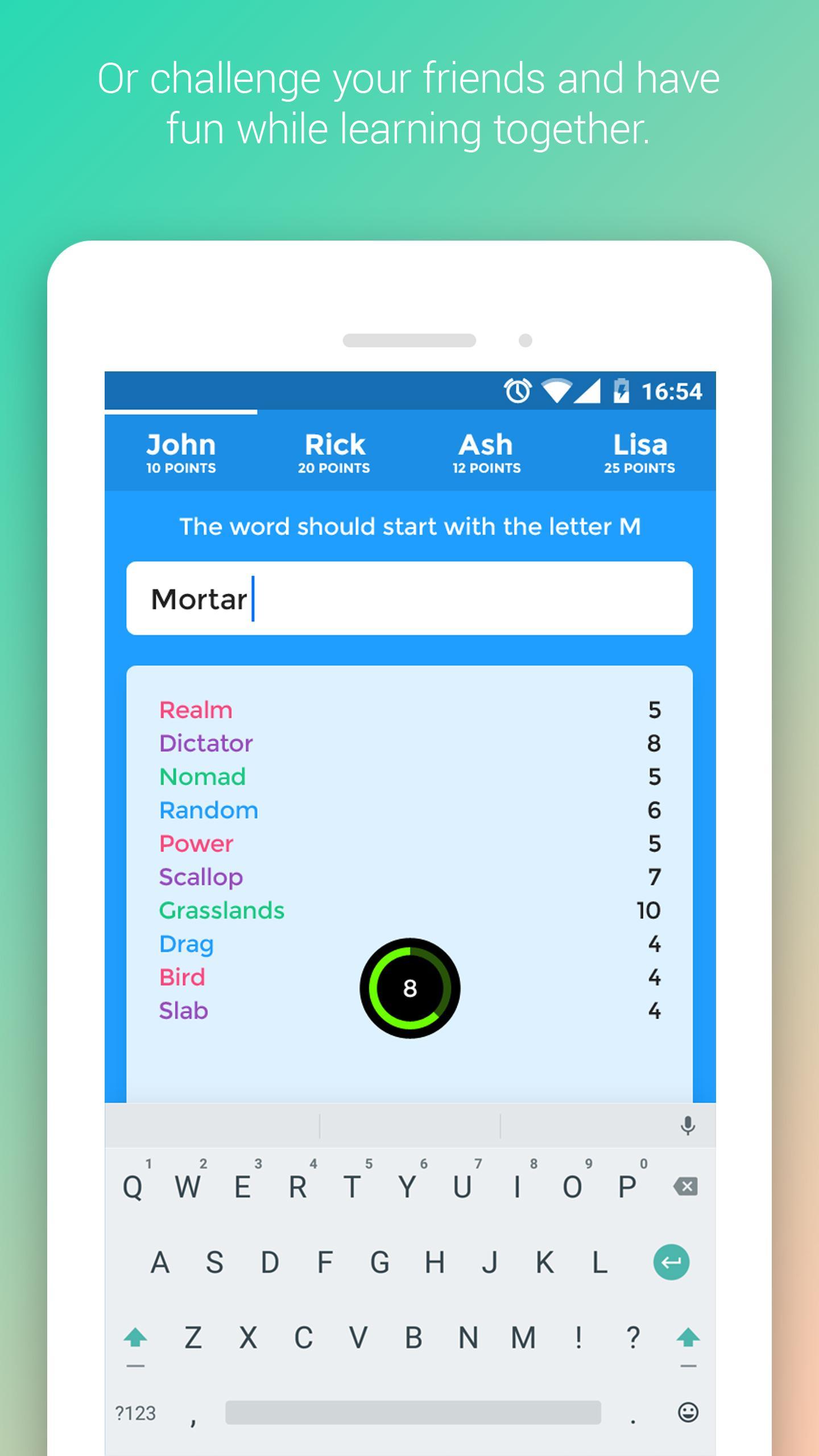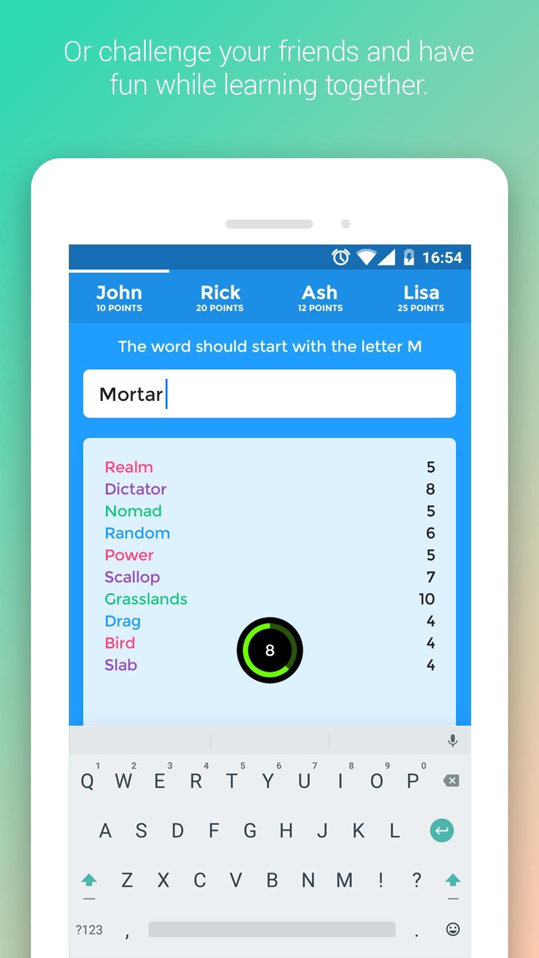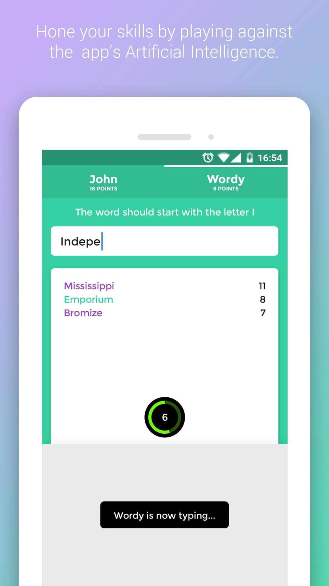 ✓ Single Player Game mode where you can play against a computer / word bot
