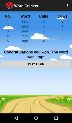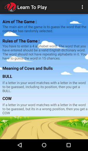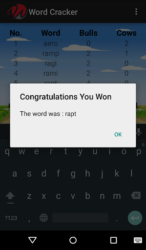The main aim of the game is to guess the word that the game generated randomly. The game will show number of cows and bulls(meaning of cows and bulls explained below) on each word you enter. You have to get 4 bulls in order to win.