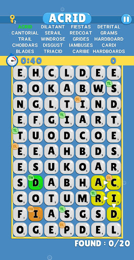 Keep your reflexes sharp and your brain alert as the letters drop. Drag tiles as they drop to avoid tall letter stacks and to find a better position to spell words you have found in your search. When a letter drops on top of a stack that is at the top of the puzzle board, your game is over.
