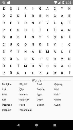 You don't find random words during the game. Sometimes the words in the table can make sense to you. These words are not within the words given to you can not mark. You are only assigned to find the words you want. WORD FINDING GAME Each word in this puzzle consists of different numbers. There are at least three letter words. You need to search in different directions while finding words through the table. These directions are up-up, right-left, cross-shaped. Sometimes the initial letter or the last letter of a word can be found in another word. You cannot move all the words to the other game level without finding them in the puzzle. SINGLE PLAY is a game that will be played by those who are looking for.