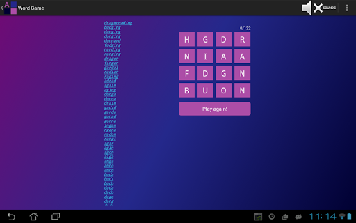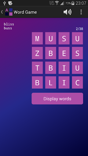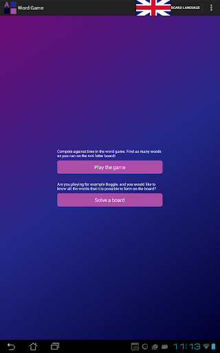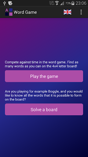 Solve the word puzzle in English or Finnish. Find as many words as possible on the 4x4 tile board by linking adjacent letters together. Every time you finish a word, you are rewarded with more time to solve the puzzle. After the time runs out, you can translate the words that you did not find, or do a web search on them.