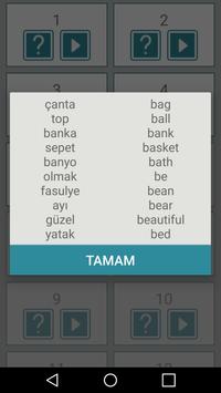 It's a progressive memory game.The aim of this game is to teach English words and increase vocabulary knowledge.If you finish the game you will learn about 700 English-Turkish words.