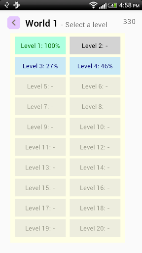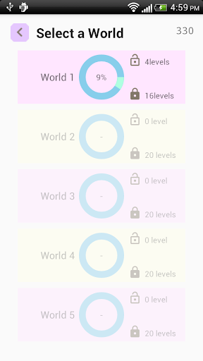 Each correct answer of missions 1, 2 and 3 carries 10, 20 and 30 marks respectively. When the game begins, all levels are locked except levels 1 to 4 of world 1. The next 4 levels are unlocked for every extra 500 points gained.
