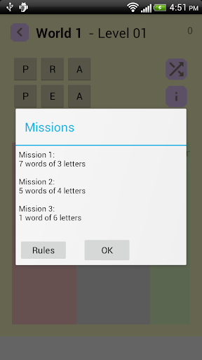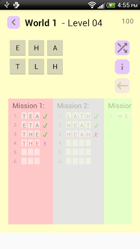 Word Polygon is a word-making game. It has 300 missions in total. Complete each mission by making the required number of words of specific numbers of letters, e.g., 6 words of 4 letters, using each of the letters given not more than once.