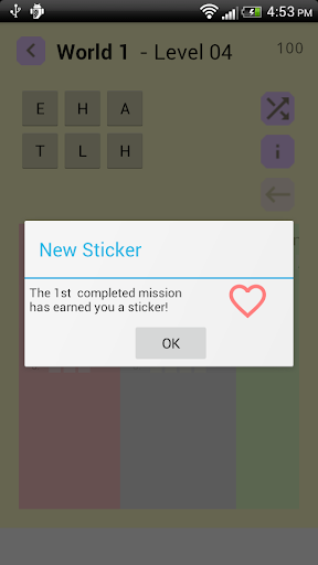 A dialog box pops up to show the new sticker is earned as a reward for an achievement: