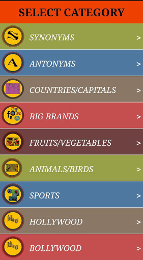Many categories like synonyms, antonyms, Countries, Capital, Big Brands, Fruits and Vegetables for Knowledge and like Hollywood, Bollywood for Fun.